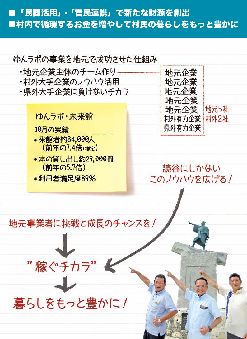 公共事業等の情報共有の方法や公募のあり方を改善し、地元企業が地元の事業に適切に参画するチャンスを作ります。 地元企業・人材の育成についても、村商工会等と連携して取り組みます。 賛否の分かれている村立小学校建て替え事業のPFI活用についても、方向性の見直しも含め慎重に検討します。